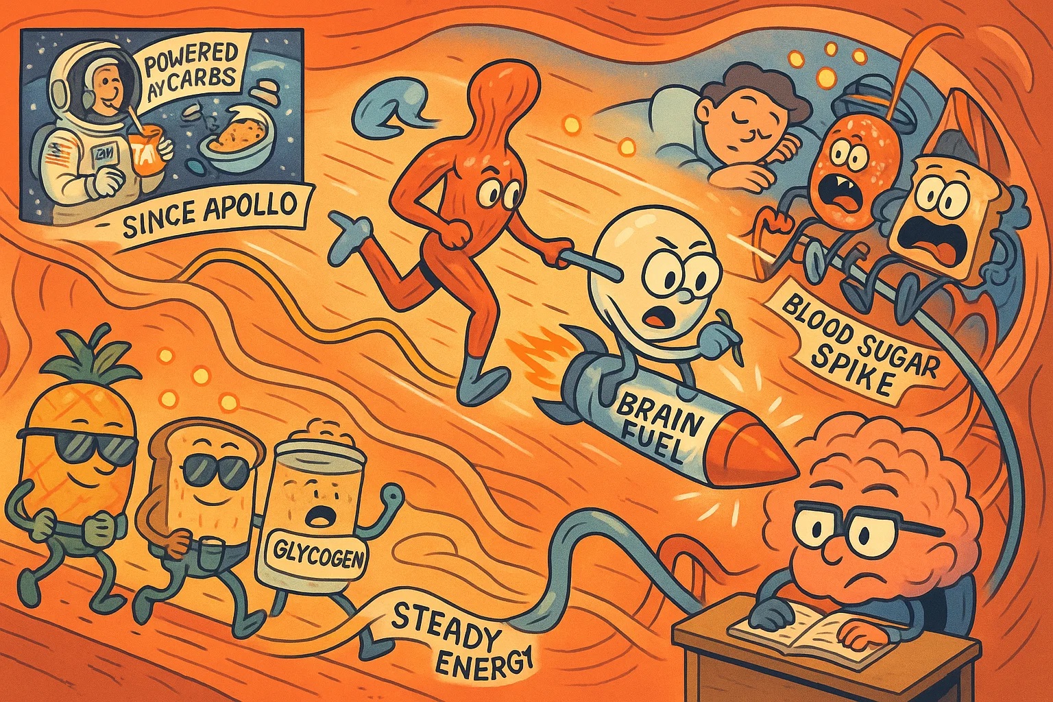 🧠 Cerita nyata: Pada misi awal NASA, para astronot diberi pilihan makanan tinggi karbohidrat seperti Tang dan pasta beku kering. Mungkin tidak gourmet—tapi karbohidrat memberikan energi yang dapat diandalkan di luar angkasa.